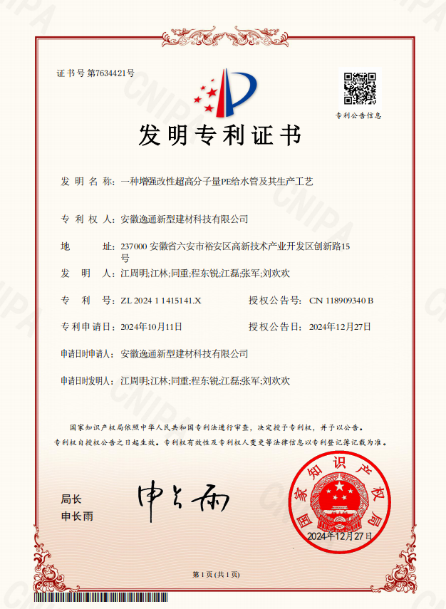 重大喜讯!逸通管业集团所属子公司发明“一种增强改性超高分子量PE给水管及其生产工艺 “获得发明专利证书。